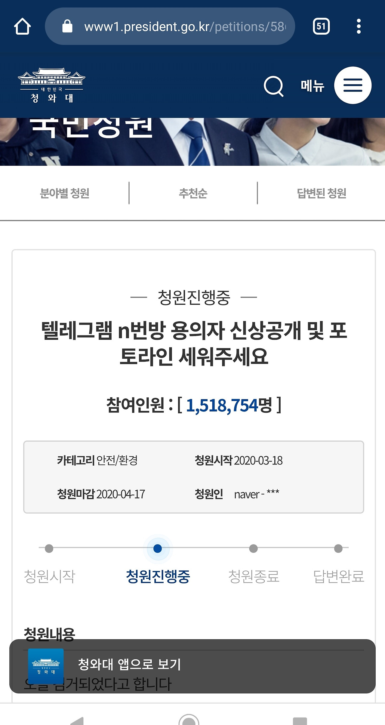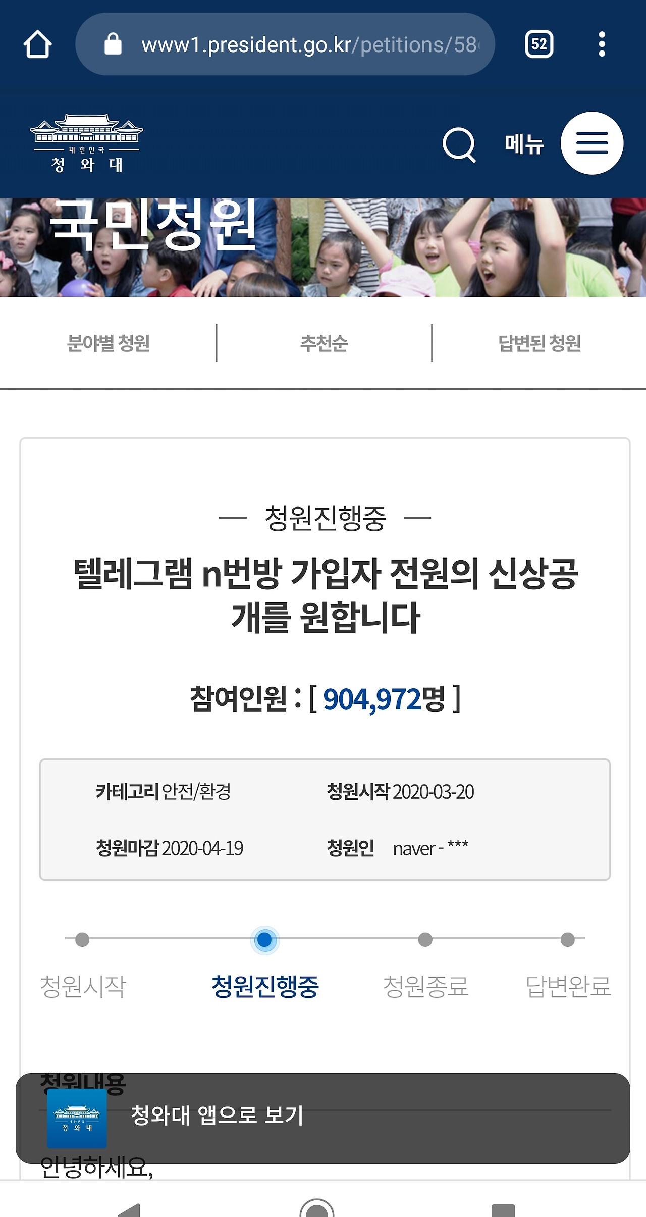 당장 청원에 나 한 명 보탠다고 해서 딱히 달라지는 건 당장 없을지도 모른다. 아니, 없을 것이다. 무엇보다 텔레그램이 국내 기업이 아니기도 한 데다가 실정법이 어쩌고 뭐가 또 어떻고 하느라. 또한, 이미 기준 수치가 넘어선 이상 숫자 하나가 늘어난다고 해서 그 자체가 유의미한 결과로 직결되지는 않을 것이다.