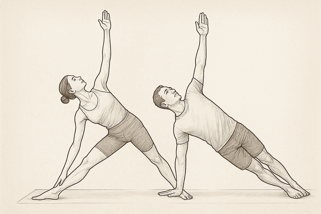 요가의 다양한 자세들도 같은 원리를 공유한다. 예를 들어 트리코나아사나(삼각자세)에서는 다리를 단단히 뻗어 지면을 밀어내면서도, 상체와 팔은 부드럽고 여유 있게 뻗어야 한다. 바시스타아사나(측면 플랭크 자세)에서는 코어와 팔에 강한 긴장을 유지하면서도, 숨은 깊고 느리게 쉬어야 한다. 몸의 어떤 부위는 단단히 힘을 주고 또 다른 부위는 힘을 빼야 하는 이완과 수축의 공존을 요구한다.