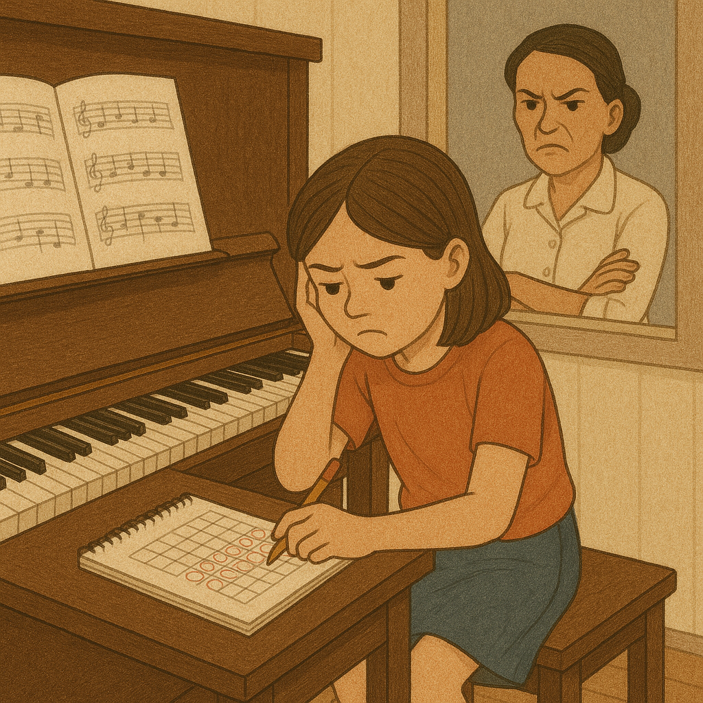 피아노가 나에게 비호감이 된 결정적인 이유는 ‘횟수 채우기’식 연습이었다. 선생님은 칸이 나뉜 수첩을 주고 숙제곡을 친 횟수만큼 칸을 동그라미로 채우게 했다. 열 개를 채워야 집에 갈 수 있었는데 나는 세 번 정도 치고 나머지는 무의미하게 동그라미만 채웠다. 그 세 번마저도 선생님이 창문으로 감시할 때만 연주하는 척 흉내를 냈다. 내가 동그라미 그리기 연습을 하는 건지, 피아노 연습을 하는 건지 햇갈렸다. 연습을 의미 있는 탐구로 경험하지 못하고 벌칙 같은 느낌으로 받아들였기 때문에 의무감과 요령으로만 버티려 했던 것이다.