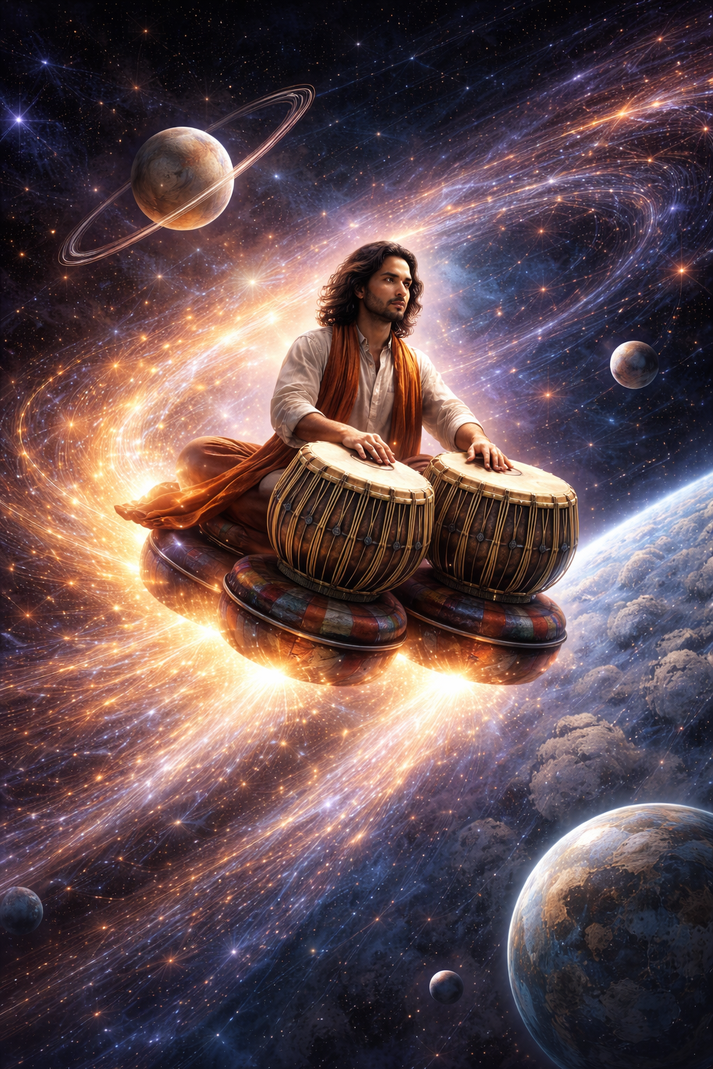 타블라를 연주할 때 손가락의 각도나 위치가 1~2도만 바뀌어도 전체의 균형이 무너진다. 검지에서 중지로 신경의 중심을 옮기거나, 심지어 연주와 무관해 보이는 발가락 끝이나 머리카락 끝으로 관측 지점을 이동시키기만 해도 감각과 신경의 네트워크는 전혀 다른 양상을 띤다. 의식이 머무는 자리가 하나만 바뀌어도 인간 내부의 힘의 배열은 재구성된다. 이는 마치 태양계에서 행성의 궤도나 각도가 아주 조금만 달라져도 소행성이 지구와 충돌하거나 생명의 균형이 무너지는 것과 같다. 손끝의 미세한 각도 차이 하나가 내 안의 우주 질서를 흔드는 이유는 여기에 있다.