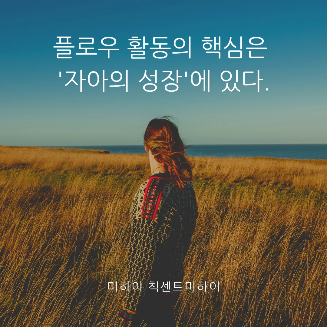 또한 이러한 활동이 flow란 이름을 갖게 된 이유는 많은 사람이 몰입을 묘사할 때, 마치 '하늘을 자유롭게 날아가는 느낌' 또는 '물 흐르는 것처럼 편안한 느낌'이라고 설명하기 때문이다. flow는 몰입이다. 몰입은 집중력이 높은 상태에서 진행되기 때문에 일의 능률을 높여주거나 효과적인 업무처리와 연관되어 있다고 단정 내리기 쉽다. 하지만 미하이 칙센트미하이 교수는 몰입을 '자아의 성장'과 연관 지어 설명한다.
