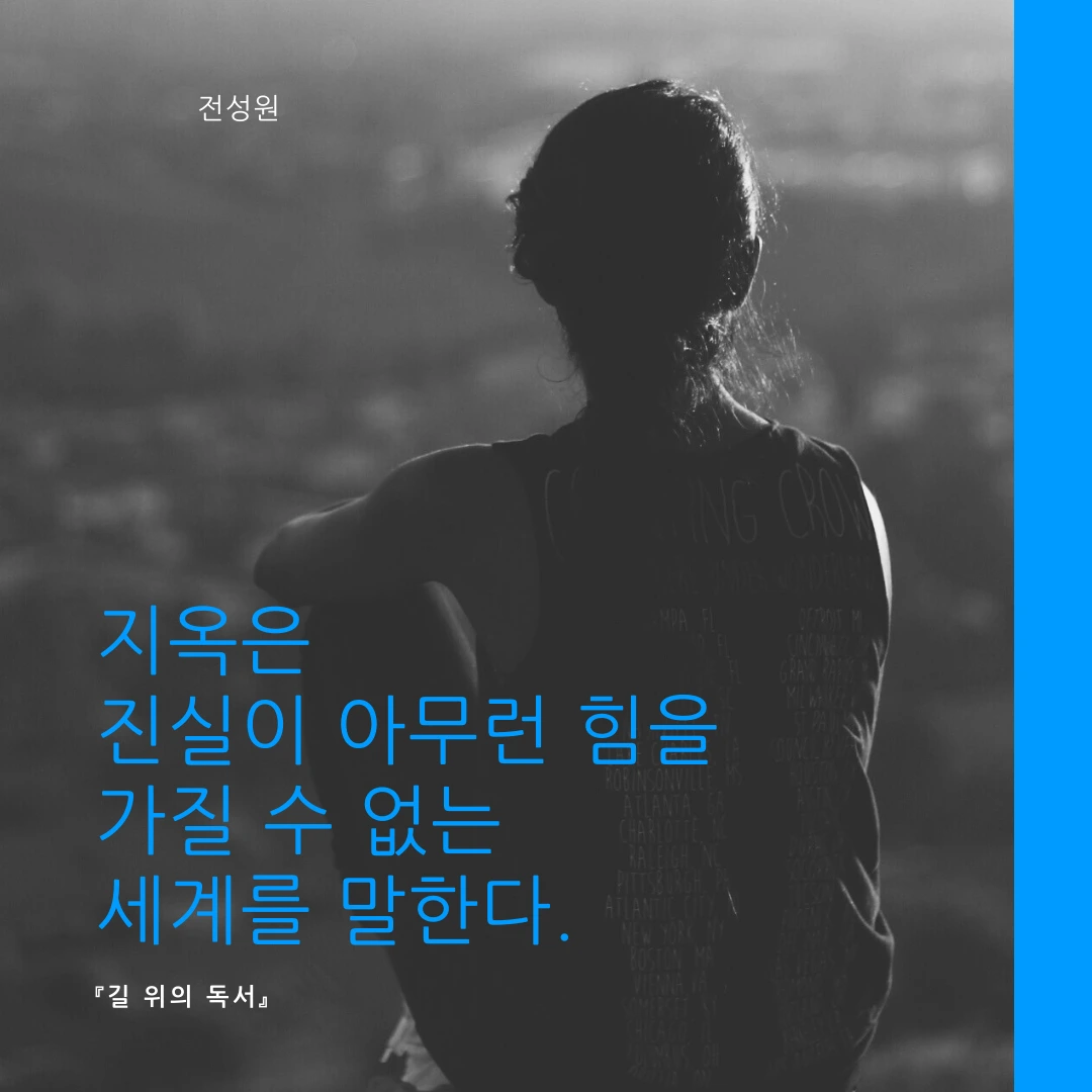 지옥은 ‘진실이 아무런 힘을 가질 수 없는 세계'를 말한다. 그것이 거짓인 줄 알면서도, 통치자가 독재자인 줄 알면서도 그가 대놓고 나를 핍박하지만 않는다면 기꺼이 스스로의 영혼까지 속일 용의가 있는 세상, 그곳이 바로 지옥이다. 시인 딜런 토마스는 "그 좋은 밤 속으로 순순히 들어가지 말라/ ······ /빛의 소멸에 분노, 또 분노하라."라고 말하지 않았던가.