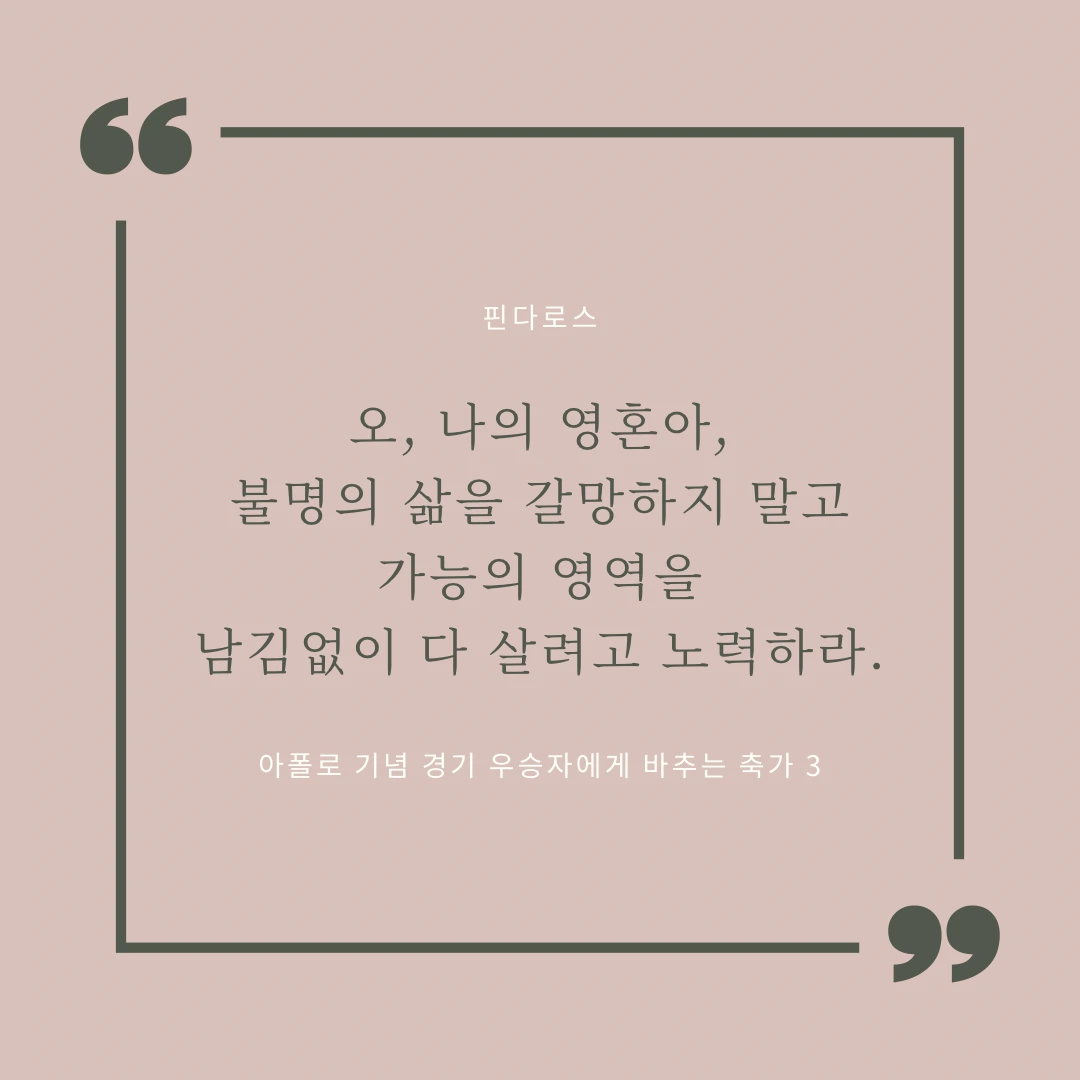 한편 시의 주인은 고대 그리스에 살았던 핀다로스이다. 그는 금수저 출신으로 기득권과 지배층의 대변인이자 시인이었다. 그의 화려한 언어 마술은 소크라테스도 따라 할 정도였다. 그래서 주변에서는 그를 '시인들의 왕자, 왕자들의 시인'이라고 불렀다. 기원전 그리스에서 전쟁의 승리를 기념하거나 각각의 폴리스가 섬기는 신을 기리기 위해 경기를 치르는 일이 흔했다. 육상 경기가 주 종목이지만 격투기와 전차 경기도 열렸다. 그러한 경기중 가장 유명했던 것이 올림피아 경기다.