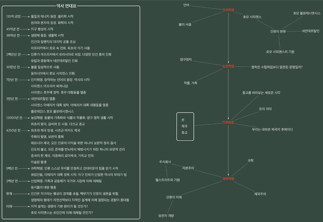 저자인 유발 하라리는 문명 발달의 단계를 크게 인지혁명, 농업혁명, 인류통합, 과학혁명(죽음도 극복한 인류)으로 보았다.