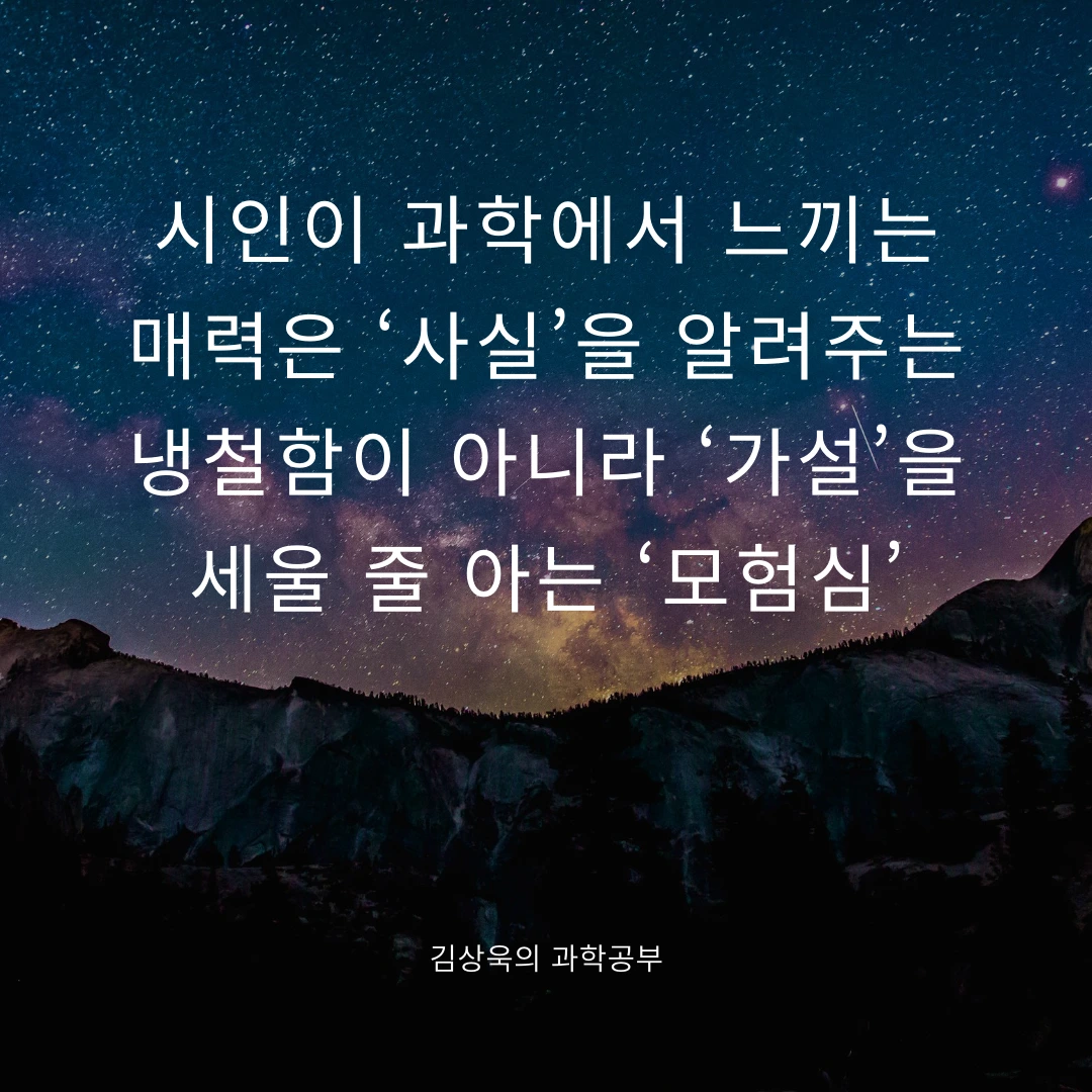 시인이 과학자의 열정에 감동받고 과학자가 시인의 창작의 시련을 알아주는 것, 인문학과 과학은 서로를 통해 더욱 깊어지고 발전할 수 있다고 생각한다. 둘 사이의 거리를 좁혀 통합과 융합의 사고로 나아가야 하는 이유이기도 하다.