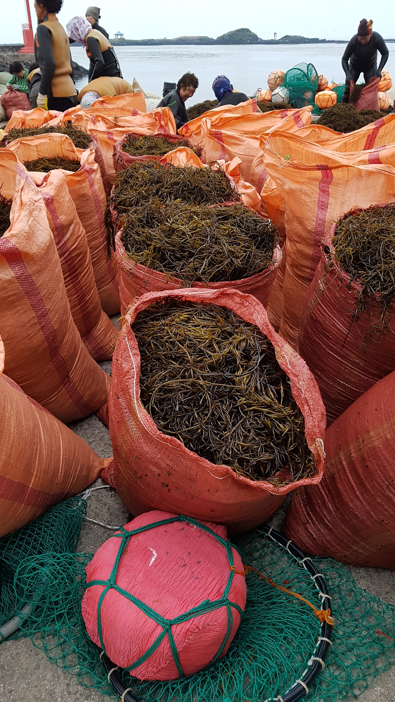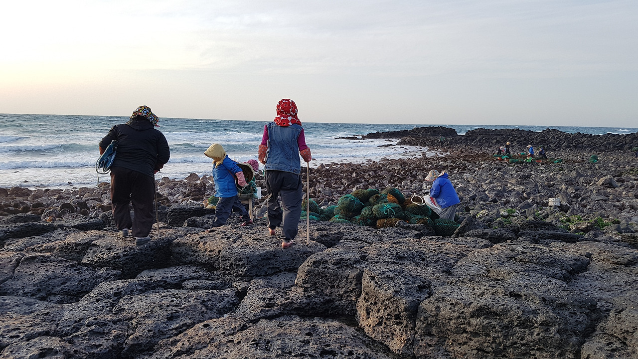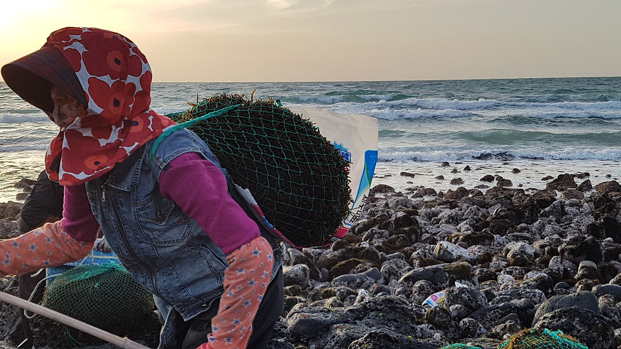 큰 바람이 불고나면 연한 해초들이 해안으로 밀려 들어온다. 때를 놓치지 않고 온 동네 해녀들이 거두러 나간다.