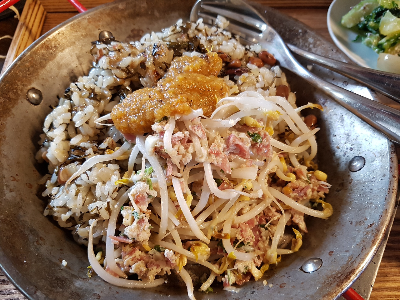 다진 양파와 모자반을 들들 볶다가 삶은 제주 어금니동부까지 들어가는 이 음식은 아프리칸들이 라틴아메리카에 이주한 뒤에 현지화 된 그들의 애환과 역사가 담긴 음식 Tacu Tacu 에서 아이디어를 얻었다.