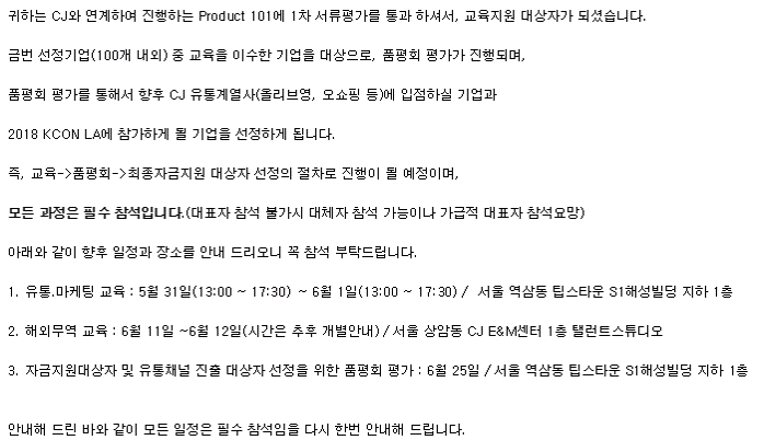 내용인즉슨, 서류평가에 통과하여 추후 일정을 안내하는 것이었는데 교육 -> 품평회 -> 2018 KCON LA 참가까지의 일정을 안내하는 것이었다. 대체자가 참석가능이나 가급적 대표자 참석요망이라 적혀있었기 때문에 '여기까지가 내 역할이겠거니' 생각이 들었다. 그런데 웬걸 대표한테 서류평가에 통과했다고 보고를 하고 나니 추후 일정도 알아서 해라고 지시를 받았다.