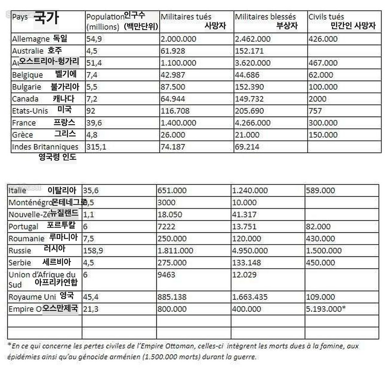 프랑스는 인구 대비 타격이 큰 국가로, 20~27세 사이의 프랑스인 27%가 사망했습니다. 특히 농업 분야 노동력 손실이 컸습니다. 일부 농촌 지역에서는 4년 동안 남성인구 100명 중 9명이 전쟁으로 사망했습니다. 이는 해당지역 농업인구의 65%에 해당되는 수치였습니다. 인구통계가 무너진 상태였기에, 휴전 1년 후, 수복된 알자스와 로렌의 회복세에도 불구하고 전체 인구는 1914년보다 100만 명이 줄었습니다(39,6만 명->38,6만 명).