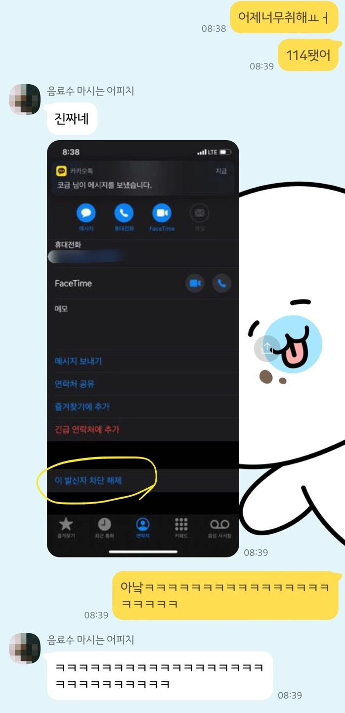 다음날 아침, K는 무슨 소리냐더니 여전히 차단된 내 연락처 캡처와 'ㅋㅋㅋㅋㅋㅋㅋㅋㅋㅋㅋㅋㅋㅋ'같은 메시지를 여러 개 보내왔다. 몇 주 전 사랑의(?) 시뮬레이션을 하고 차단을 안 푼 거였다. 나는 도대체 차단해놓고 전화하라는 건 무슨 심보냐고 분통을 터뜨렸다. 더 슬픈 건 그 카톡을 하는 와중에도 내 번호는 여전히 차단되어 있었단 사실... 술이 준 쓸데없는 용기 덕분에 나는 한 사람도 아니고 두 사람한테나 차단당했다는 뜻밖의 사실을 알게 되었다. K는 너무 빨리 들켰다면서 너스레를 떨었고 나는 그 날 이후부터 습관적으로 차단했냐고 묻게 되었다. 간밤의 더블 차단 소동으로 나는 아이폰 방해금지 모드는 신호가 한 번 가고 수신차단은 신호가 아예 안 간다는 것, 방해금지 모드는 부재중 전화가 남고 수신차단은 아무것도 안 남는다는 걸 몸소 깨달았다.