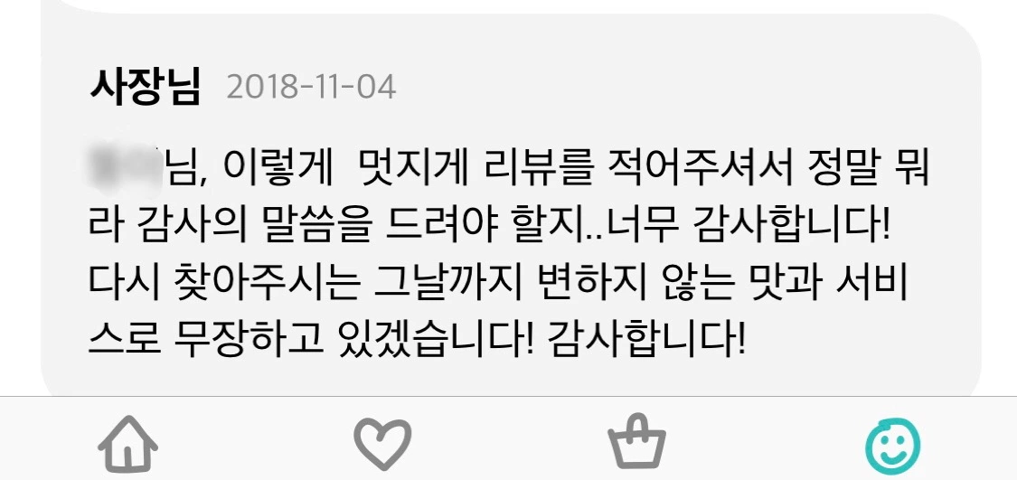 돈 안 낸 감자가 돈 낸 감자 같다는 감자튀김 양 칭찬. 치킨의 가장 기본인 튀김옷의 바삭함과 치킨조각 크기의 적절성. 소스의 다양성과 맛 칭찬. 화룡점정으로 다음에도 시켜먹겠다는 재주문 의사 고백. 떡 얘길 못 쓴 것만 빼면 내가 봐도 기승전-치킨사랑-이 묻어나는 완벽한 리뷰였다. 저녁이 되어 다시 배달의 민족에 접속해보니 어느덧 사장님이 댓글을 달았다. 역시 잘되는 집은 소통을 잘하는 법이다. 하하.