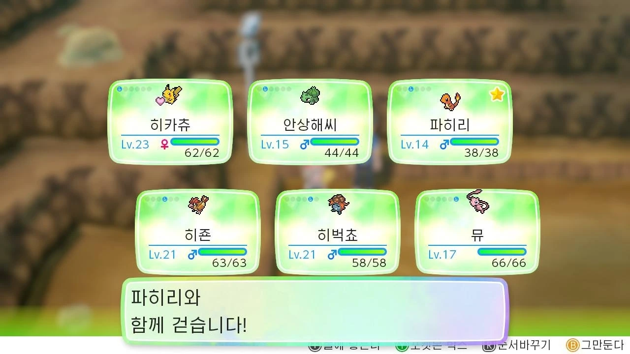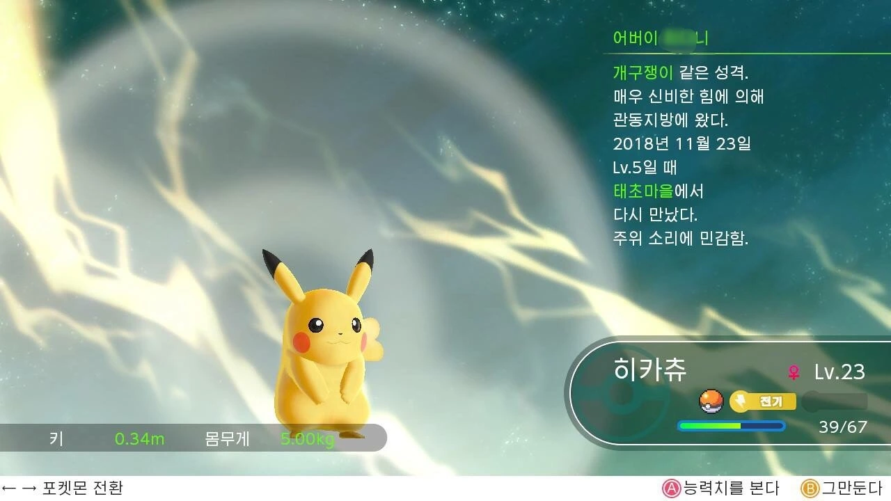 나의 히카츄는 어느덧 레벨 53이 되었고, 다른 것에 신경 쓸 새도 없이 나는 오늘도 열심히 포켓몬 아기들을 키운다. 스위치에선 포켓몬 상태를 조회할 수 있는데 그 곳에는 어버이 이름이 나온다. 어버이가 누구여. 하고 보니 내 이름이 뙇. 세상에. 스물아홉. 미혼. 남친없음의 대명사인 내가 어버이가 되다니! 막중한 책임감에 몸둘 바를 모르겠다.