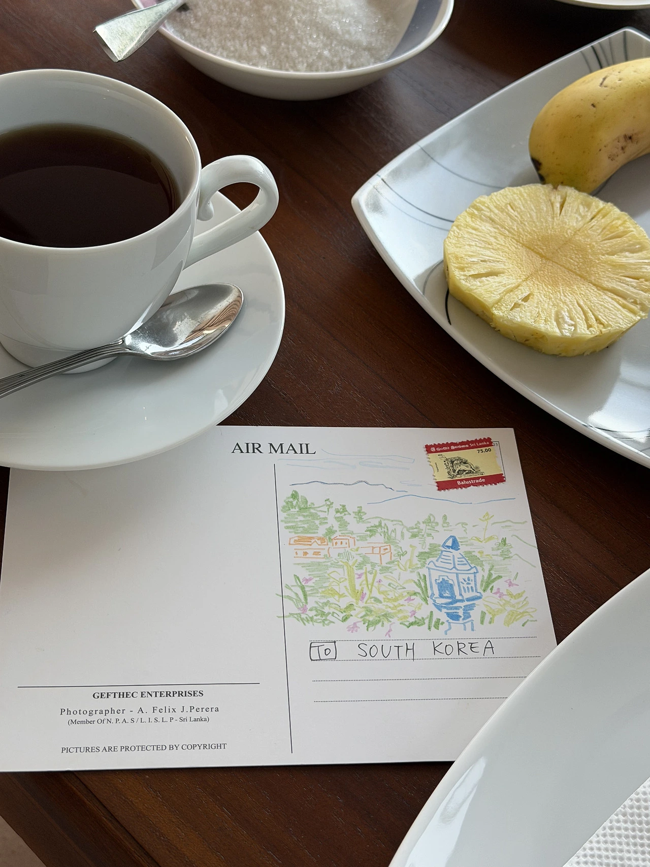 여기 와서 매일 그랬던 것처럼 해 뜨는 시간에 알람을 맞추어 눈을 떴다. 엘라의 마지막 날 아침 은은한 주홍색 해돋이를 보았다. 조식을 먹으며 엽서를 썼는데 쓸 말은 별로 없어 그림을 더했다.