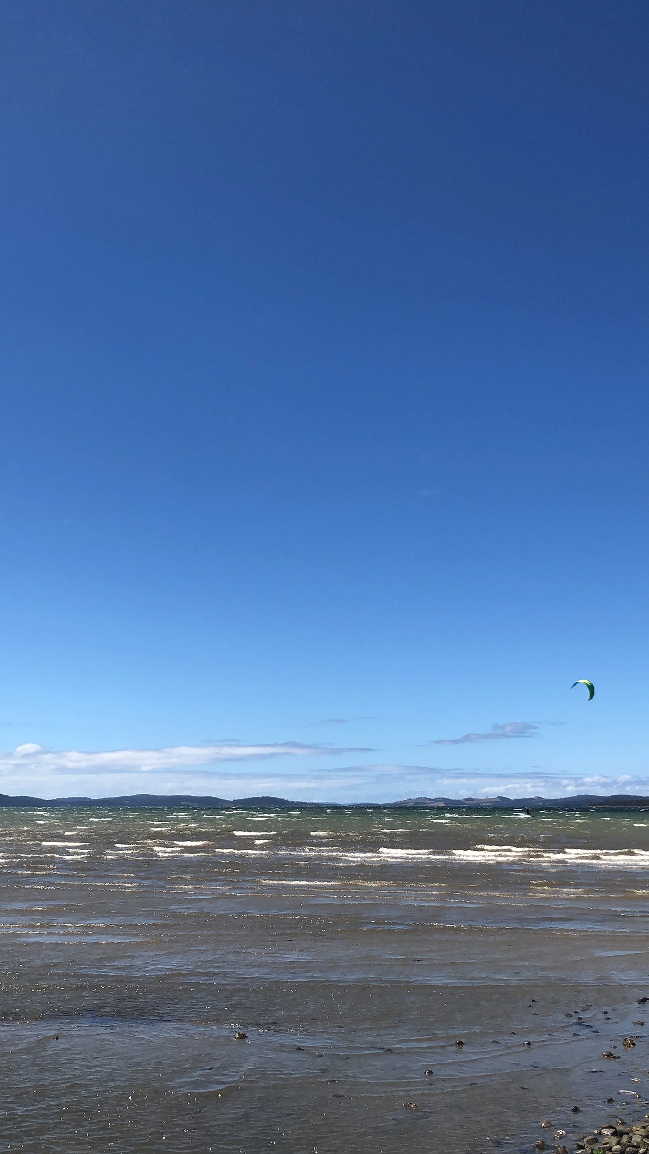패러글라이딩과 서핑을 접목한 해양 스포츠(카이트보딩이라고 한다)인가 보다. 쨍한 연두색의 낙하산이 파란 하늘을 가르며 날았고 보드에 올라탄 사람은 곡예를 하듯 바다 위를 질주했다. 와아- 바라보는 사람마저 짜릿하게 하는 장면에 아이들과 나는 감탄하며 소리쳤다. 젊은 남녀 커플이 카이트보딩을 번갈아가며 탔다. 그들은 캠핑 동안 보지 못했던 사람들인데 바람이 강하게 불자 카이트보딩을 타려고 서둘러 바다로 나온 것 같았다.