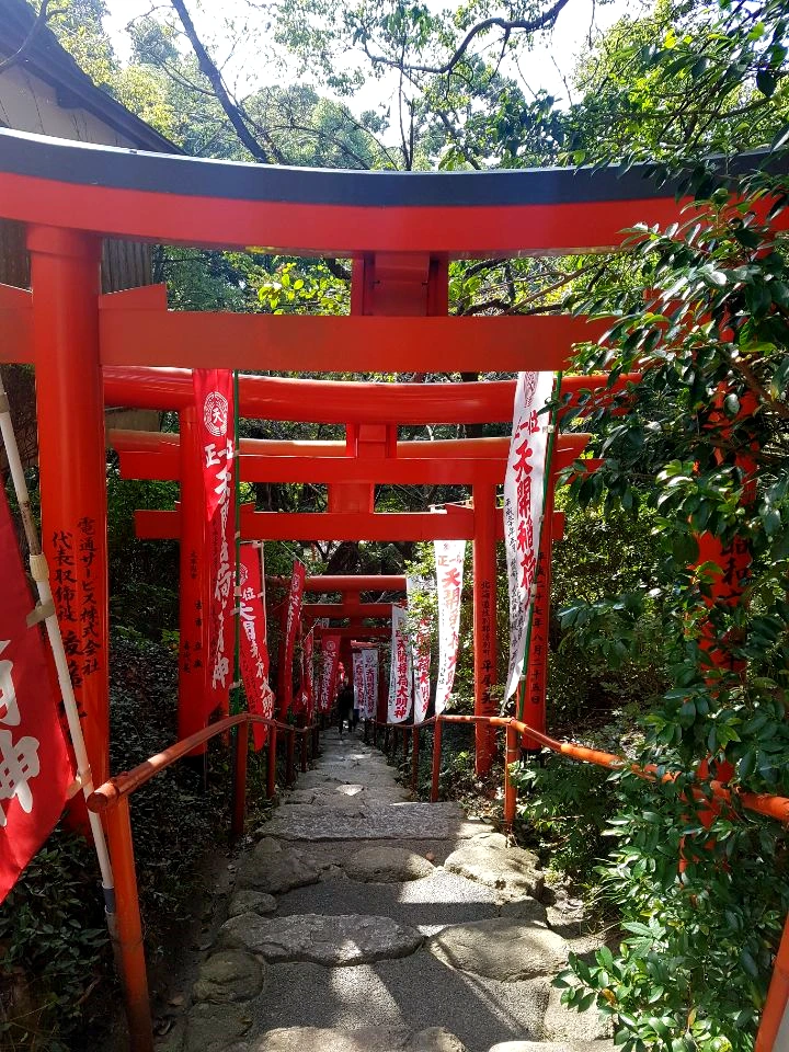 길을 따라 쭉 저런 빨강, 하양 깃발과 빨간 토리이(신사 입구의 문)들이 세워져있다.