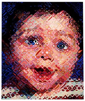 척 클로스는 주로 초상화를 그리는 화가인데 멀리서 봤을 때는 정말 사진인지 그림인지 구분이 가지 않을 정도로 사실적으로 그려낸 초상화이나 그것을 자세히 봤을 땐 얼굴을 이루고 있는 조그만 마치 추상회화 같은 픽셀이 모여서 큰 형태를 만들어내고 있음을 알 수 있다.