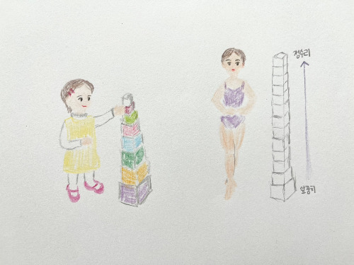 마치 다음 주에도 만날 것처럼 자연스레 수업이 시작되었다. 아이와 블록 쌓기를 하는 어른처럼 원장님과 내 몸을 잡고 한 칸씩 쌓아 올리면서 중심을 찾는 법을 되새겼다. 집중하고 발 앞꿈치부터 천천히 몸을 세워 정수리 끝까지 중심축을 단단히 쌓으면 흔들림이 없이 곧게 설 수 있었다. 블록이 하나라도 흐트러지면 세웠던 탑이 기우뚱하듯, 정수리 중심이 살짝만 기울어도 몸은 한쪽으로 기울어져 쓰러지고 만다. 몸을 제대로만 쌓아 올리고 더해서 버티는 힘까지 챙길 줄 안다면 훨씬 동작이 안정적이고 턴을 돌 때도 흐트러짐이 없다는 걸 느꼈다. 방법을 알았으니 쌓아 올리는 것은 온전히 내 몫이 되었다.
