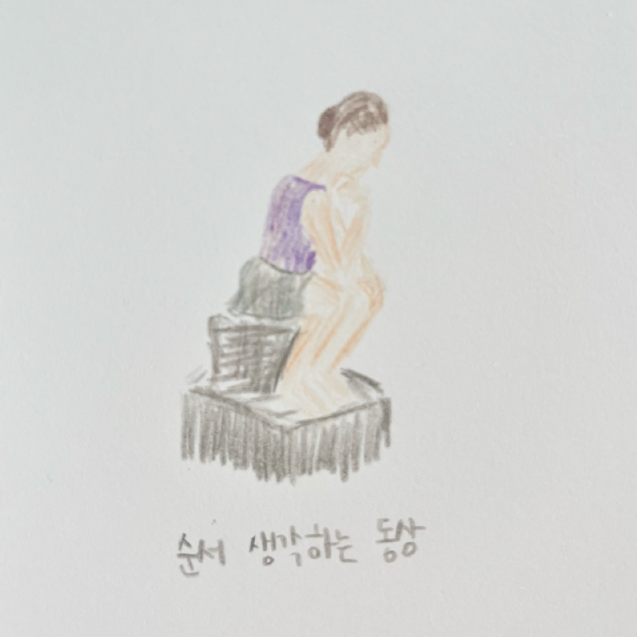 도입부를 시작으로 차근차근 순서를 배워나갔다. 원래 음악 속도보다 배속을 줄이고, 순서도 흐름만 따라가도록 바꾼 터라 작품의 기둥만 세워놓은 수준이었다. 이게 작품반의 최선이라는 걸 배우면서 알았다. 수업의 패턴은 대충 이랬다. 구석에서 배울 순서를 짧게 배운 뒤, 다 같이 할 때 뒤에서 황급하게 얼레벌레 따라 한다. 마무리로 나를 제외한 나머지 사람들은 혼자 해보는 시간이 있는데, 그때 뒤에서 배운 순서 복기와 다음에 배울 동작을 예습하는 시간을 홀로 가졌다. 짧은 시간 습득해야 할 양이 많으니 버겁기도 했다. 선생님은 시범을 보여주시고 "이 동작을 세 번 반복할 거예요. 어렵지 않죠?" 했을 때, 진짜 쉬운 거 같이 보이긴 했다. "오, 네!!" 대답하고 혼자 해볼 차례. 솟으려던 내면의 용기가 나왔다가 다시 들어갔다. 분명히 선생님이 하실 땐 분명 쉬워 보였는데, '잠깐..' 하며 생각하는 로댕이 되어버렸다.