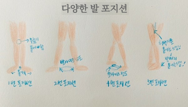 기초반 수업은 발레를 알아가는데 중점을 두는 편이었다면, 중급반은 자세와 기술을 연마하는데 중점을 둔 것 같았다. 원장님은 한 명씩 다리모양을 봐주며 1번 발모양을 다시 잡아주셨다. 내 다리모양은 약간 X자였고, 1번 발 모양을 새로 잡아 바뀐 발모양으로 자세를 잡으니 근육에 힘이 들어가는 느낌을 느끼기 쉬워졌다. 1번 포지션이라고 다 같은 포지션이 아니었다는 점이 신기했다. 매트 운동을 할 때도 허벅지 안 쪽과 엉덩이 근육 단련에 집중되는 운동들이 많았다. 안 쓰이던 엉덩이 근육들이 처음 움직이는 기분이었다. 1번 자세에서 막연하게 엉덩이에 힘을 준다기보다 퍼져있는 양쪽 엉덩이를 합체한다는 느낌으로 모아야 했다. 그렇게 모으면 엉덩이살에 보조개 같이 쏙 들어가는 느낌이 들고 자연스럽게 발끝부터 코어까지 힘이 들어가 단단한 느낌이 들었다.