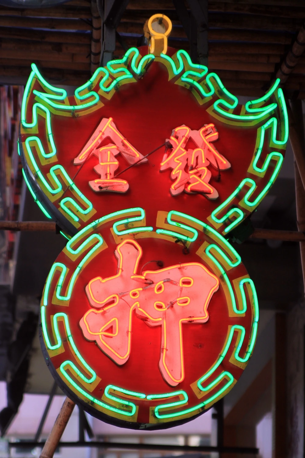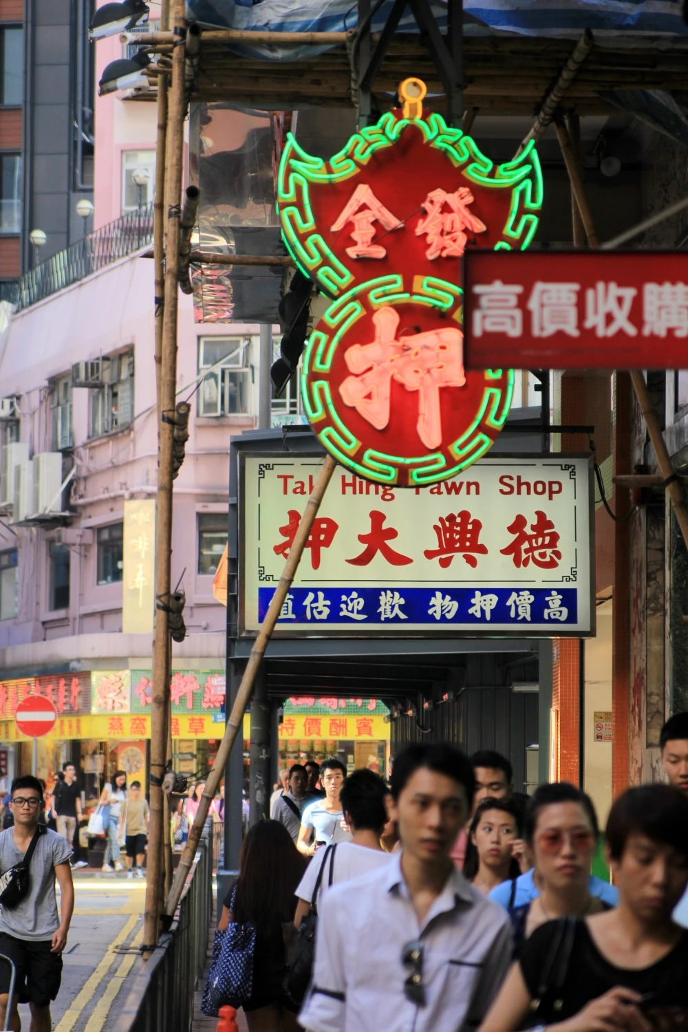 빨간 바탕에 녹색의 네온사인 테두리, 그리고 그 안에 크게 적혀 있는 “押(누를 압)”이라는 한자. 이 간판은 바로 홍콩의 전당포를 상징하는 간판이다.