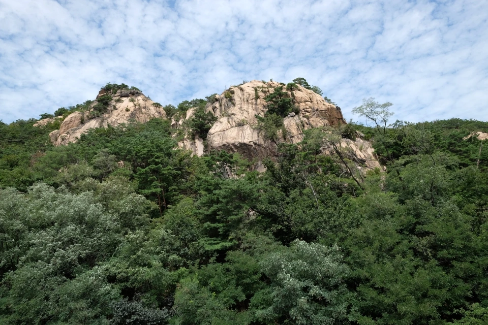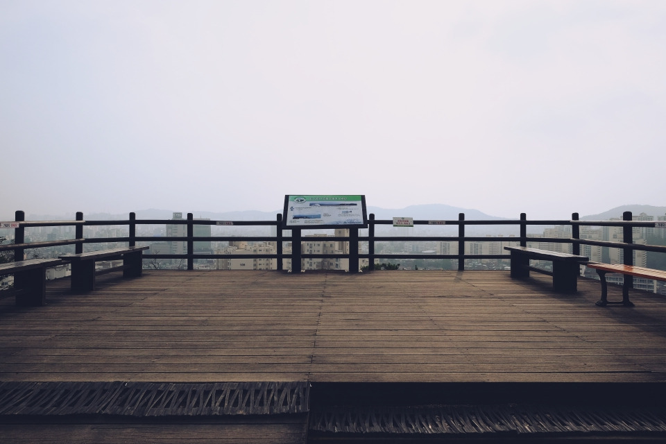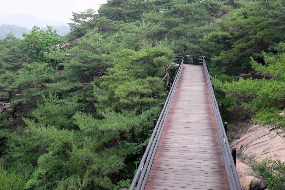 전망대에서 시원한 바람을 한껏 즐기며, 잠시 휴식을 취하고 내려오면, 이제 시야가 탁 트인 구름다리가 이어진다. 오른편으로는 기세 좋은 너른 바위가 벽처럼 서 있고, 왼편으로는 아까 전망대에서 보았던 도시 풍경이 다시 펼쳐진다.