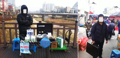 하지만, 발로 뛰는 영업이 많은 사업인 만큼, 지원금도, 모아둔 용돈도 다 떨어질 무렵. 밑바닥 영업을 배우고 사업 자금을 벌기 위해 30년 노하우가 녹아 있는 양말 노점 장사 팀에 들어가 노점 장사를 배웠습니다. 하루 매출은 100만 원에서 많게는 250만 원. 노점상계 상위 10% 안에 드는 장사라고 하니 일을 잘 배워서 내가 직접 장사를 해서 돈을 벌어야겠다는 결심도 했습니다. 하지만 여러 가지 사정으로 양말 노점상을 접고, 다른 아이템인 안경 세정제 노점상을 했습니다. 처음에는 판매하려는 저 조차도 구매하기 싫게 생긴 케이스에, 다이소에서 천원이면 살 수 있을 것 같은 제품을 5천원과 1만원에 팔아야했습니다. 정말 진심으로 팔리지 않을 것 같아서 장사를 하기 싫었으나, 이것도 하다보니 노하우가 생겨 하루 매출 26~28만 원 정도가 되었으며, 매출의 80%가 남기에 어느 정도 먹고 지낼만 했습니다. 양말부터 안경 세정제까지, 이런 제품들을 판매하다보니 앞으로 그 어떤 제품이든 판매할 수 있겠다는 자신감이 생겼습니다. 하지만 안경 세정제는 제품상의 문제 때문에 판매하는 제 자신 조차도 어느 순간부터 판매하고 싶지가 않았습니다.