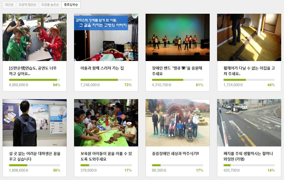 실제로 위 이미지는 '나눔기부'라는 곳의 종료임박순으로 모아본 것인데요. 이제 하루가 지나면 모금 기간이 끝이 나는데, 대부분이 목표 금액을 달성하지 못한 모습입니다.