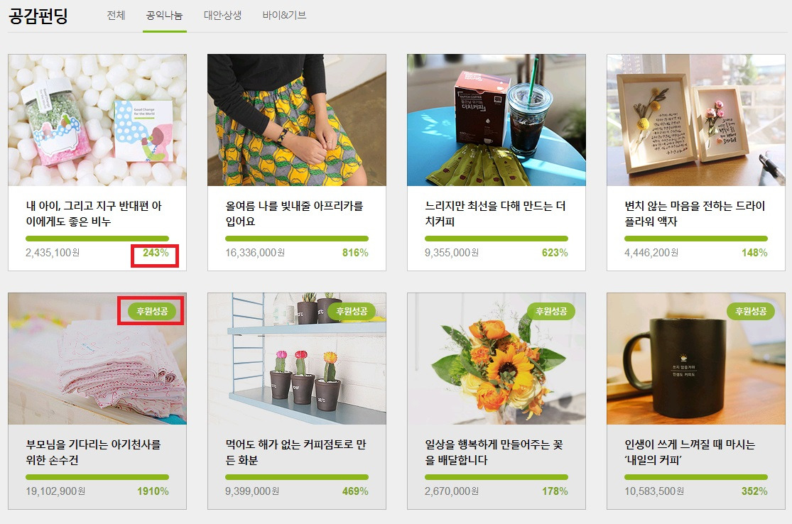 반면, 아래의 공감펀딩을 보시면 모금 종료일까지 25일이 남았는데도 불구하고 243% 달성하기도 하며 종료 전에 이미 816%를 달성한 모금도 보입니다. 또한 공감펀딩에 올라온 것은 전부 후원 성공 했으며, 목표 금액을 전부 훨씬 넘는 상태였습니다.