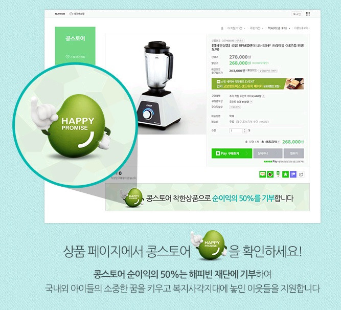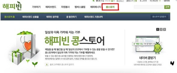 쇼핑몰에서도 로그인한 회원에게만 포인트를 적립해 주듯, 네이버 회원이 로그인하여 구매한 것은 콩으로 적립해주고 그렇지 않은 구매에 따른 기부금은 지금처럼 해피빈에게 주는 것이 낫이 않을까요.