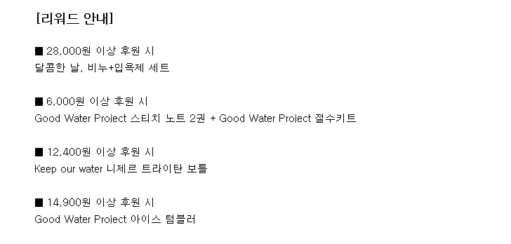 그 이유는 해피빈의 공감펀딩도 리워도(보상)이라는 것 보다는 엄밀히 따지면 리워드 상품의 구매를 통한 기부이기 때문인데요. 상품 구매를 공감펀딩에서는 리워드라는 말로, 상품 구매에 따른 기부를 후원이라는 말로 정말 잘 포장한 것이 아닌가 싶습니다. 그 결과 기부자들이 심적으로 느끼는 기부에 대한 거부감을 조금 떨칠 수 있지 않을까 생각해봅니다.