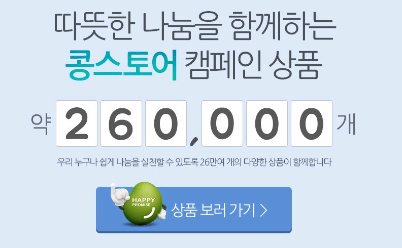 현재 콩스토어는 네이버 상품 페이지로 따로 되어 있습니다. 상품의 개수는 약 26만 개입니다. 제가 예전에 콩스토어를 보며 다양한 상품을 통해 기부로 이끌어야한다고 생각했는데, 그 부분을 해결한 모습이 보여 좋네요.