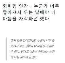 구글에 검색한 '회피형 인간'의 최상단에 위치한 블라인드의 글을 변명의 대상으로 삼겠다. 썸과 연애에 치중된 글이지만 충분히 확장해서 받아들여질 수 있는 부분이 많은 사례들이 담겨있다. 이 글에 의하면 회피형 인간의 특징들은 이렇다.
