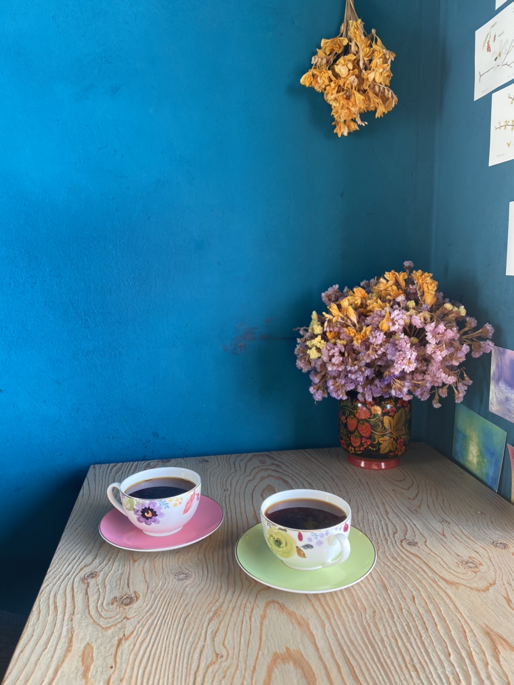 이번 생일엔 난생처음으로 갬성 카페와는 거리가 먼 뼛속까지 줌마 카페에도 가봤다. 해민 스님의 진리가 담긴 글이 한 편에 떡하니 붙어져 있고, 곳곳에 형형색색의 드라이플라워가 반기는 인테리어의 줌마 카페. 여기서 킬링 포인트는 꽃무늬 그득한 찻잔이다. 이 곳에서 남자 친구와 꽃무늬 찻잔에 가득 잠긴 핸드드립 커피를 마셨다.