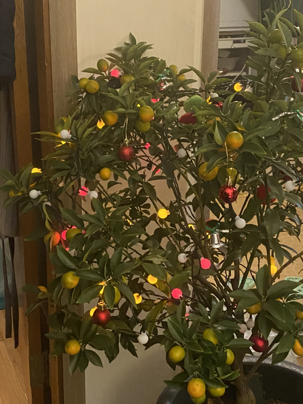 모두를 위해 연말에는 집에서 가족과 함께, 또 오빠와도 집에서 함께. 집에서 하는 파티가 확정된 이상, 올해는 집안에 연말 분위기를 내보고 싶었다. '트리를 만들자.' 오빠에게 트리를 만들어보자고 했다. 이미 지난번 파티 때 사놓은 루돌프 머리띠도 있었다. 오빠는 자신의 낑깡나무를 트리로 꾸미면 어떻겠냐고 했고, 나는 너무 근사하다고 생각했다.