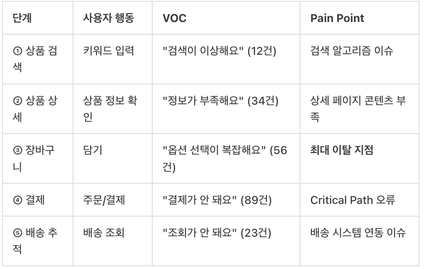 여정 맵을 통해 정량 데이터(이탈률)와 정성 데이터(VOC)를 함께 보면 우선순위가 명확해집니다.