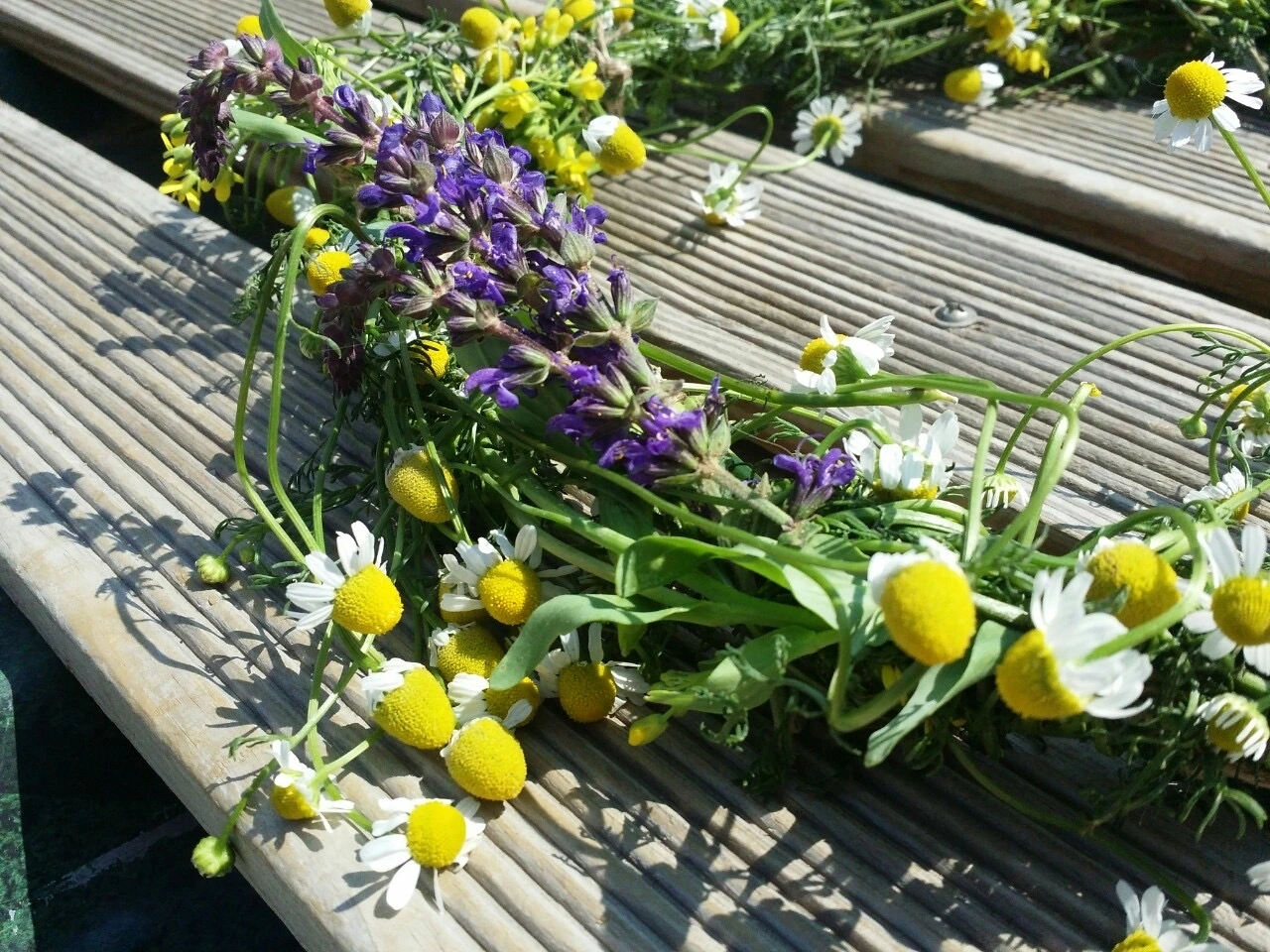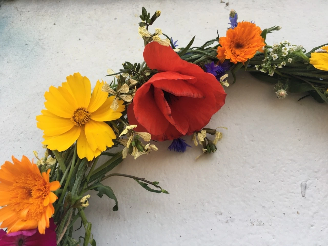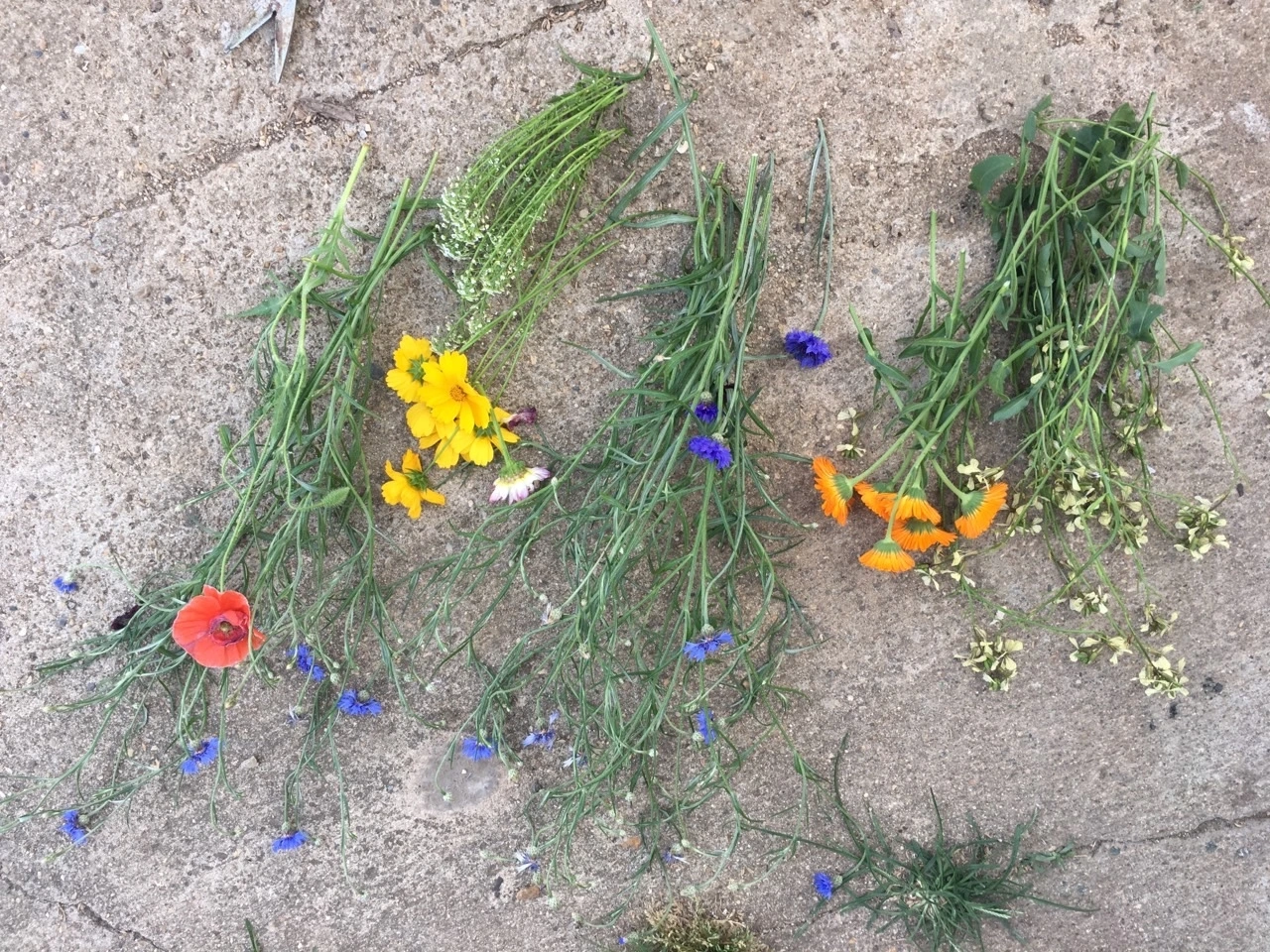나의 텃밭에는 꽃이 함께 자라고 있다. 토마토, 오이를 심기 전에는 양귀비, 금계국, 금잔화등의 봄 꽃을 심기도 했고 봄꽃들이 지고 난 뒤에는 캐모마일, 샐비어 등의 허브로 그 자리를 대신 하기도 했다. 꽃을 텃밭에서 함께 키우면 미관상 보기에도 좋지만 화려한 꽃의 색과 향기로 벌과 나비들을 불러 모야 해충을 잡아 먹고 열매 채소들의 수분을 돕기도 한다. 이런 이유만으로도 텃밭에 꽃을 키울 충분한 이유가 되지만 다른 한가지 이유가 더 있다. 꽃다발을 만들어 선물해 주거나 집안을 장식 할 수 있다는 것이다.