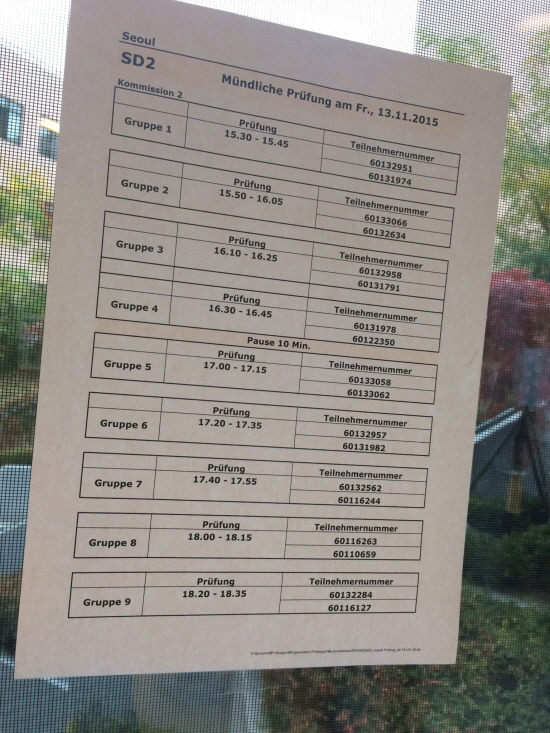 듣기, 읽기, 쓰기 시험이 끝나면 두 사람이 짝으로 구술 시험을 보러 이동하게 되는데, 자신의 파트너는 당일 공지되는 표에서 알 수 있다.(어디에 있는지 안다면 미리 합을 맞춰볼 수도 있겠다)