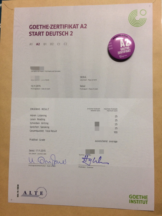 외국어를 잘하고 싶다고 해서 꼭 시험을 치뤄야 할까. 어차피 취미인데 기를 쓰고 공부해서 시험까지 치를 필요가 있나 하는 질문을 많이 받게 된다. 하지만 잘 생각해보면 나를 포함하여 대부분의 사람들이 새로 시작한 어떠한 분야에서 오래가지 못하는 것에는 '구체적'인 목표가 없어서인 경우가 많다. 막연하게 잘하고 싶은 생각만으로는 스스로에게 동기부여가 되지 못하고, 특히 외국어처럼 오랜 기간동안 지속적으로 노력을 기울여야 하는 과목에서는 더욱 그렇다. 또한 어떤 분야던 기초부분이 튼튼해야 스스로 공부도 할 수 있고 애착도 가질 수 있게 되는데, 시험만한게 없다. 대단한 수준의 시험도 필요없다. 가장 기초수준이나 기초에서 한 두단계정도의 상향이면 된다. 시험의 목적 자체가 일정 언어수준을 검증하기 위한 것이므로, 시험을 준비하는 동안 당연히 해당 수준에 도달하는 과정을 거친다. 비용이 좀 부담되기도 하지만, '공짜로' 하는 것 치고 애착을 가지는 것 못봤다. 노력과 비용을 들인만큼 동기부여도 커지는 것이다. 따고나면 이보다 더 큰 뿌듯함이 없고, 이보다 더 자랑스러운 '훈장'도 없다. 나는 그냥 할 줄 아는 사람이 아니라, 독일문화를 대표하는 독일문화원에서 공식적으로 인정하는 독일어 능력자가 되는 것이다.(라고 얘기하면 좀 거창하게 들리지만, 어쨌든 더듬더듬 수준은 되는걸로..!)