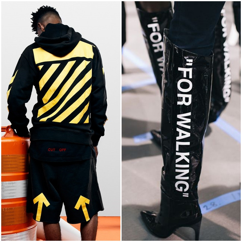 두 번째, 기존 디자인 차용. 오프 화이트에는 따옴표, 화살표, 대각 평행선의 시그니처 디자인이 있다. 따옴표는 문장에서, 화살표⑶는 이정표에서, 대각 평행선은 공사장 입간판에서 쉽게 발견할 수 있다. 그만큼 흔하다. 버질 아블로는 오프 화이트 제품 곳곳에 이 세 가지를 더했다. 단어를 강조한 따옴표는 말을 거는 느낌을 준다. 화살표와 대각 평행선은 무언의 신호를 보내는 듯하다. 로고 플레이를 하는 옷과는 달리 경쾌한 분위기를 자아낸다.