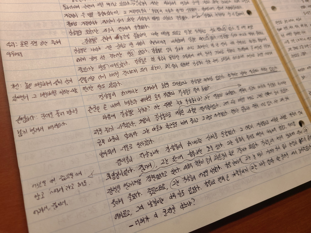 일회독에 이어서 일회사(寫)했다. 그럼에도 책을 온전히 이해하지 못했다. 아직 공부해야 할 것이 가득하다. 적어도 10번 이상은 곱씹어야 비로소 알 것 같다. 칼의 노래는 나에게 많은 것을 준 책이다. 교두보 삼아서 몇 번이고 읽고 쓰기를 반복할 것이다. 현재보다 성장한 미래의 나를 기대하는 바이다.