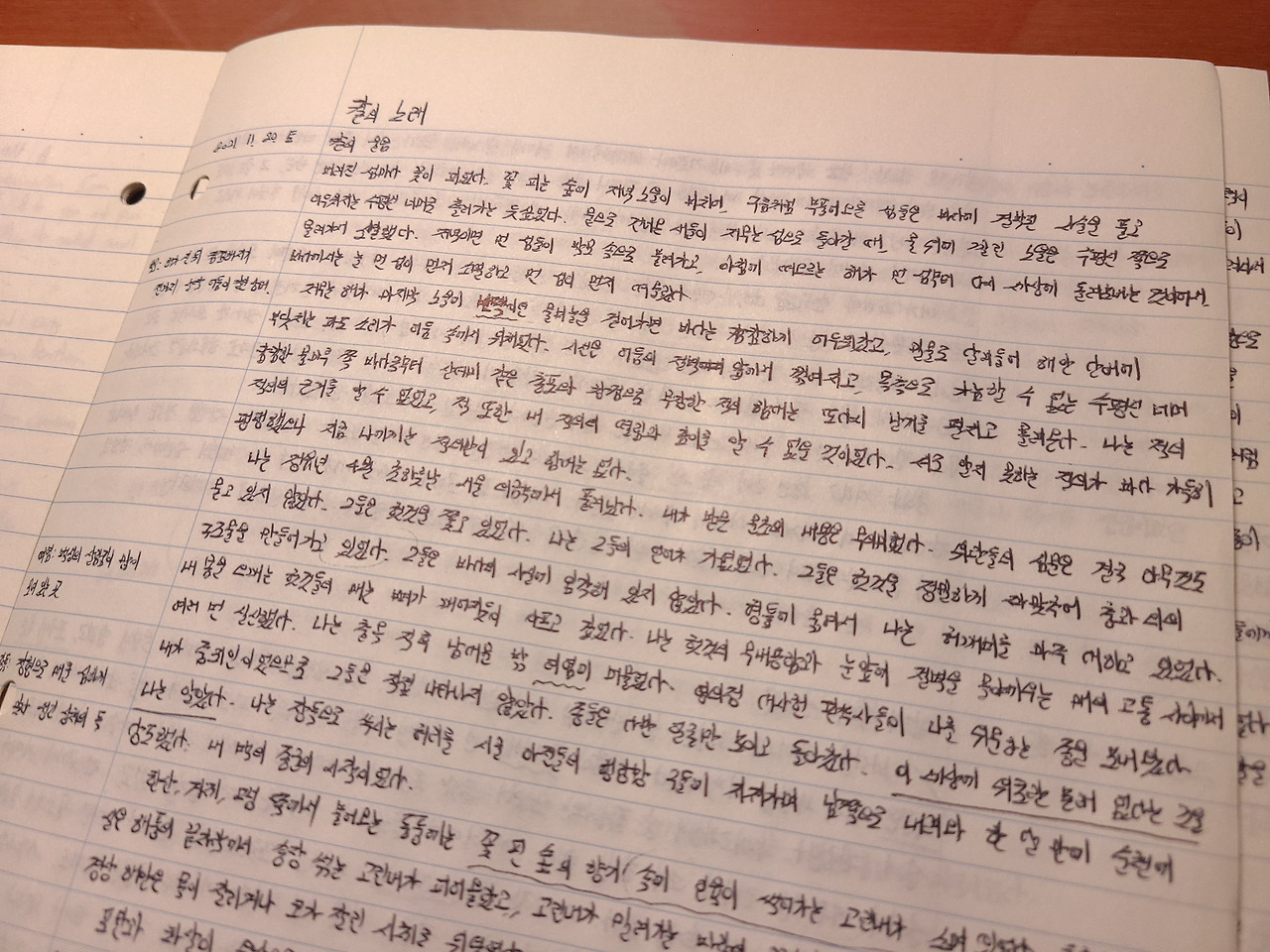 완독 후 반년이 흘렀다. 나는 내 글쓰기 실력에 아쉬움을 느끼고 있었다. 그때, 문득 필사가 떠올랐다. 글쓰기 실력을 향상시키는 비법으로 필사는 늘 손꼽힌다. 필사는 지극히 고전적이고 아날로그한 훈련이다. 필사로 득을 본 프로 작가들이 동서고금을 막론하고 있다. 그들은 모두 종이에 펜이나 연필로 한 작품을 처음부터 끝까지 받아 적었다. 예나 지금이나 마찬가지이다. 첨단 전자기기로 가득한 요즘 세상에도 손으로 쓰는 필사는 그 명맥을 유지하고 있다. 나는 그 이유가 분명 있을 것이라고 생각했다. 마침 유명 저술가들도 칼의 노래의 필사를 권유했다. 나는 공책을 꺼내서 칼의 노래를 필사하기 시작했다.