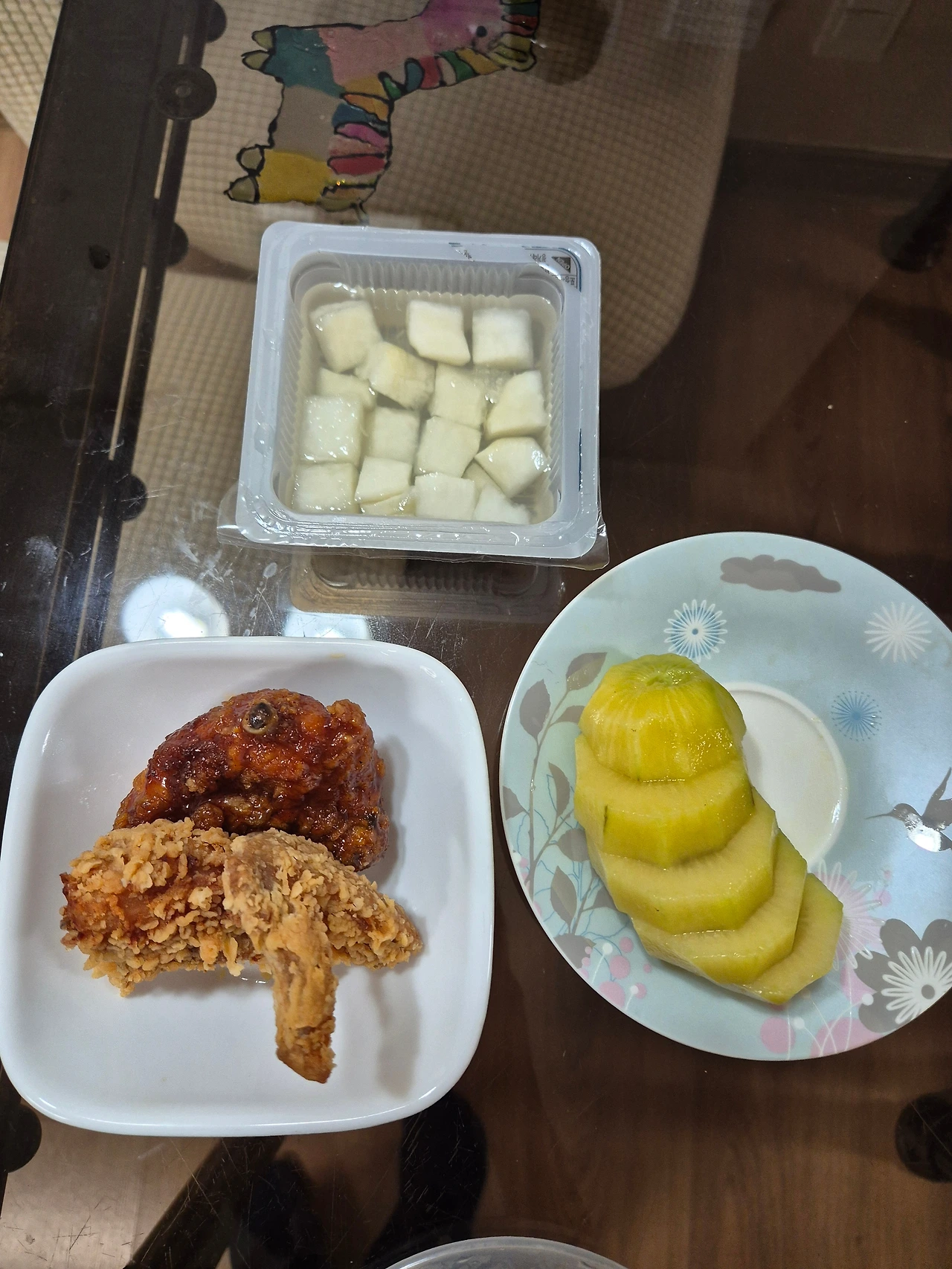 우앙.. 치킨 두 조각에 키위 한 개가 예쁘게도 놓여있다.