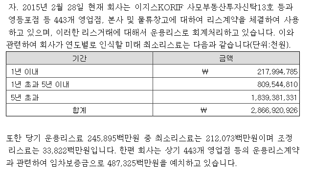 하지만 주석 11 우발채무 및 약정사항을 보면 홈플러스는 약 13년 동안 2조 8천7백억 원의 리스료를 부담합니다. 또한 주석 6에서 알 수 있듯이 리스 기간 종료 후 부동산 원상복구비 2백억 원을 추가로 지출해야 하고요. 두 금액을 더해 보니 남은 리스 기간 동안 총 2조 9천억 원을 임대료 등으로 지출해야 합니다. 연평균 2,200억 원 규모네요. FY14년도 홈플러스의 영업이익이 약 1,900억 원 정도인데 2,200억 원의 임대료는 부담스러운 금액임에는 틀림없습니다.