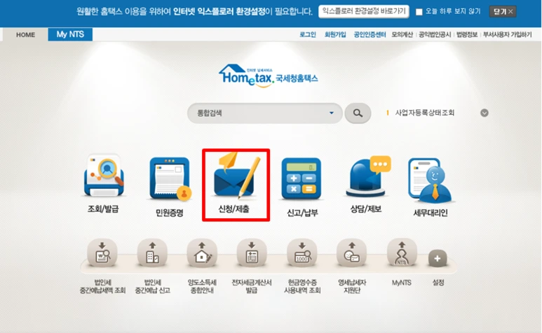 1. 홈택스 로그인 ( www.hometax.go.kr ) 후 [신청/제출]
