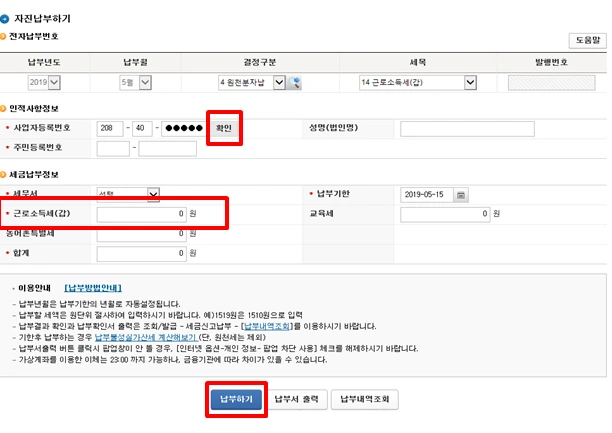 5. 사업자등록번호 확인 → 세액입력 → [납부하기]