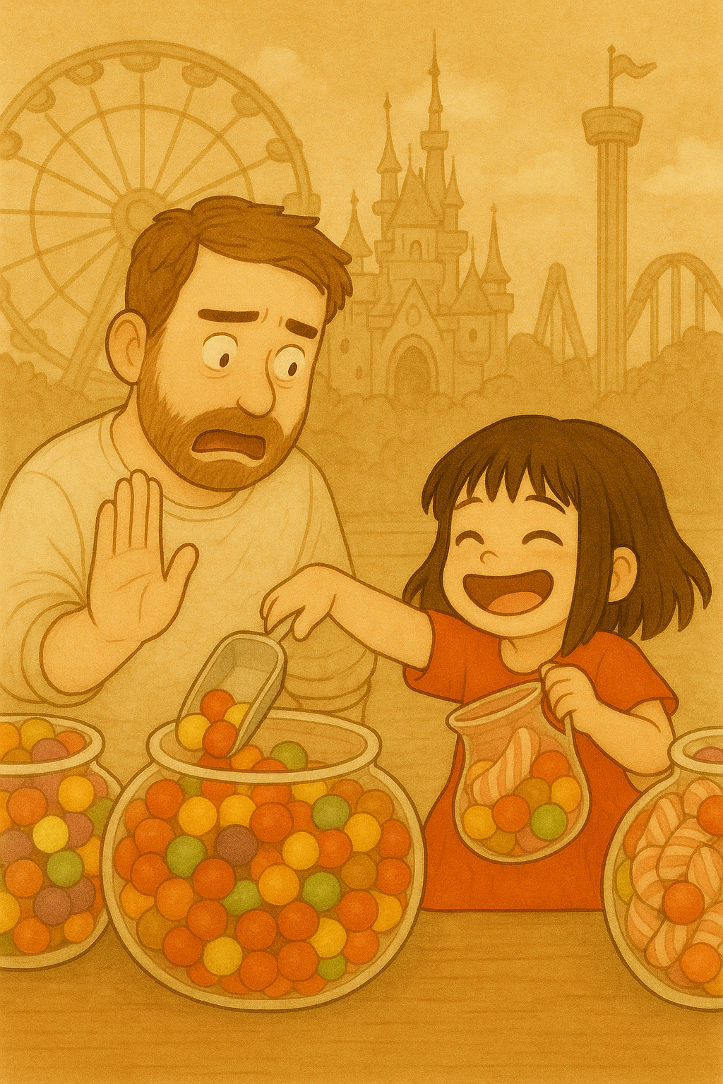 아빠: 한을 풀러 왔구먼. (마구 젤리, 사탕을 푸는 린나를 보고 놀랜다!) 그만 담아 이 녀석아!!!