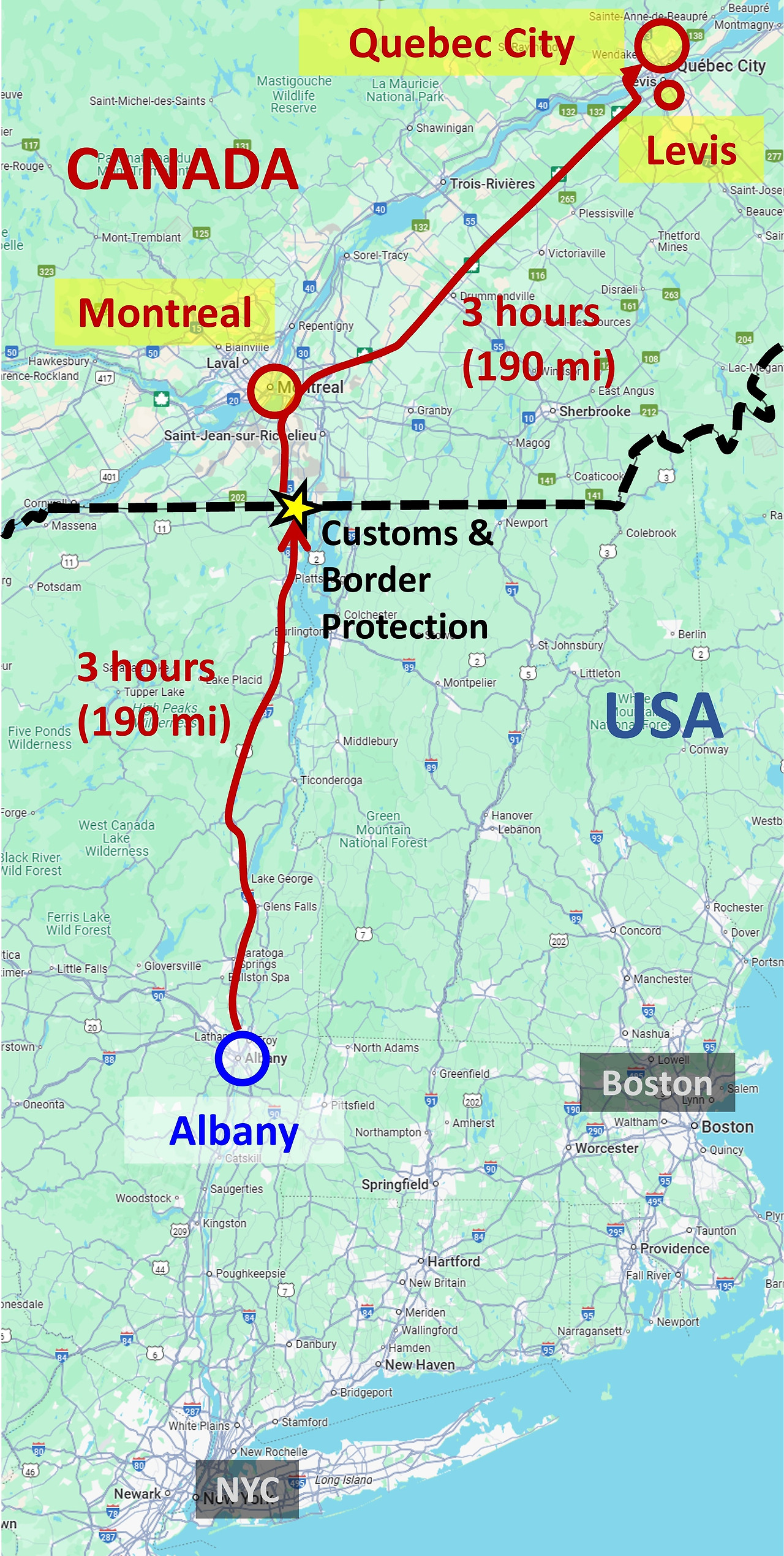 우리가 사는 곳에서 퀘벡시티까지는 운전으로 6시간 정도 거리다. 이젠 이 정도 거리의 운전은 큰 어려움이 없게 되었지만, 이번엔 차를 타고 국경을 넘어갔다 돌아오는 것이라 신경 써야 할 것들이 있다. 사실 캐나다에 가는 것은 별 문제가 없는데, 여행을 마치고 미국에 돌아올 때 주의해야 한다.