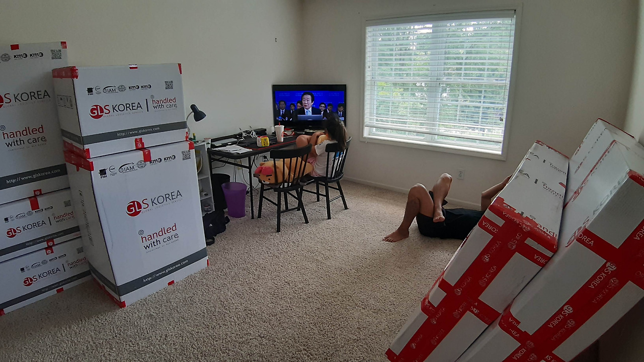 (왼쪽) 한국에서 적어 온 이삿짐 목록표 (오른쪽) 안방에 잔뜩 쌓인 이삿짐. '에라 모르겠다.' 세은이와 티비를 보고 있는 베짱이 남편. 일하고 있던 아내가 찍음.