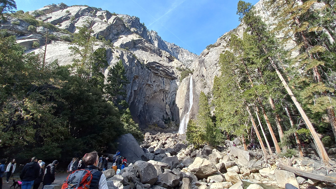 비지터 센터에서 거대한 세퀘이어 나무들이 즐비한 숲길을 따라 15분 정도 걸어가면, 요세미티가 보유한 또 다른 장관인 '요세미티 폭포(Yosemite Falls)'가 있다. 총 높이 약 740m에 달하는, 미국 내 최대 높이의 이 폭포는 3단에 걸쳐 떨어지는데 Upper, Middle, Lower로 나뉘어 있다. 비지터 센터에서 이어진 산책길을 따라가면 Lower Falls의 아랫부분까지 가 볼 수 있다. 바위가 잔뜩 쌓인 위로 물이 쏟아지는 모습이 제주도 정방폭포와도 비슷한 느낌이 있었다. 물론 크기나 높이면에서 요세미티가 훨씬 크긴 하다.