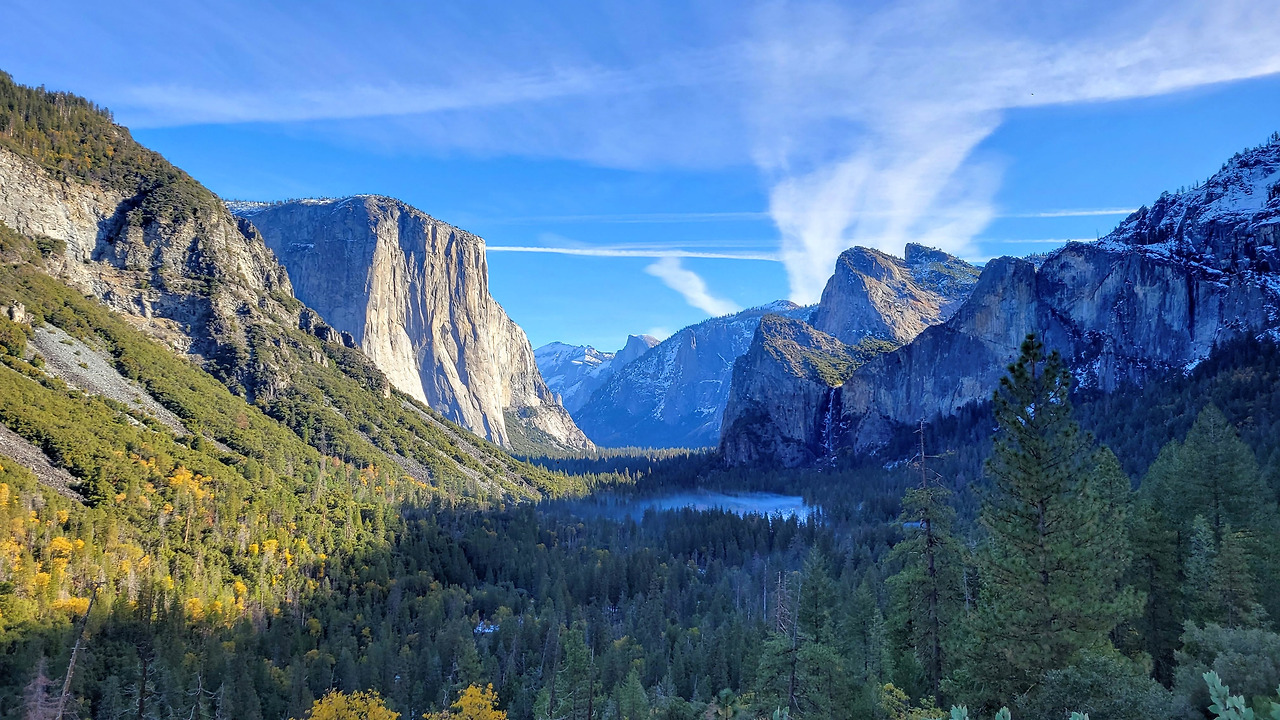 우리는 골프 같은 것에 쓸 시간이 없기 때문에 곧바로 터널 바로 끝에 있는 전망대, 요세미티 밸리의 핵심 경치를 한눈에 볼 수 있는 '터널 뷰(Tunnel View Point)' 전망대에 도착했다. 요세미티를 찾은 관광객들이 제일 먼저 찾는 이곳, 산 중턱 높은 위치에 있는 터널 뷰에서 보는 풍경은 요세미티 국립공원의 핵심 요약판이다. (이름은 참 단순하게도 터널 끝에 있어서 터널 뷰라고 한다. 터널을 개통한 1930년대 미국인들은 작명 감수성이 부족했던 것 같다.)